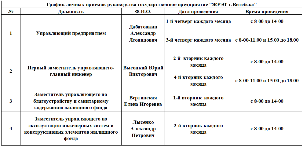 В ГП ЖРЭТ г. Витебска личный прием граждан и юридических лиц осуществляют: